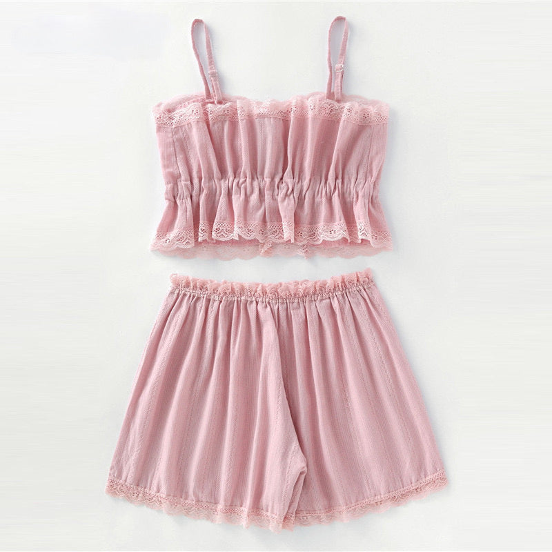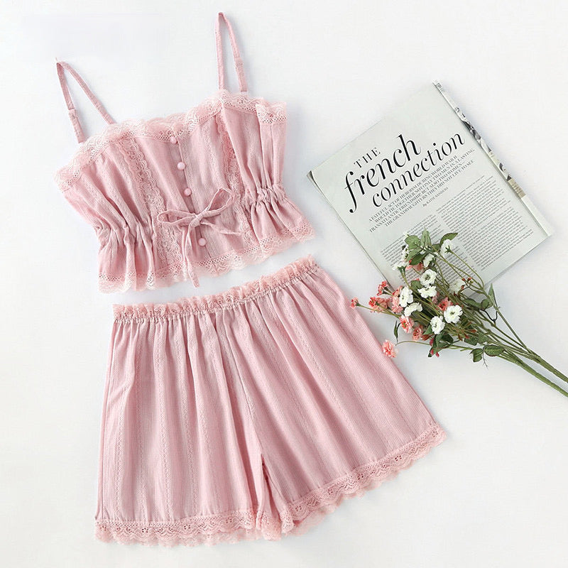 Cuerpo de talle corto con tirantes finos, abierto por delante con botones. Pantalón corto con puntillas de encaje.