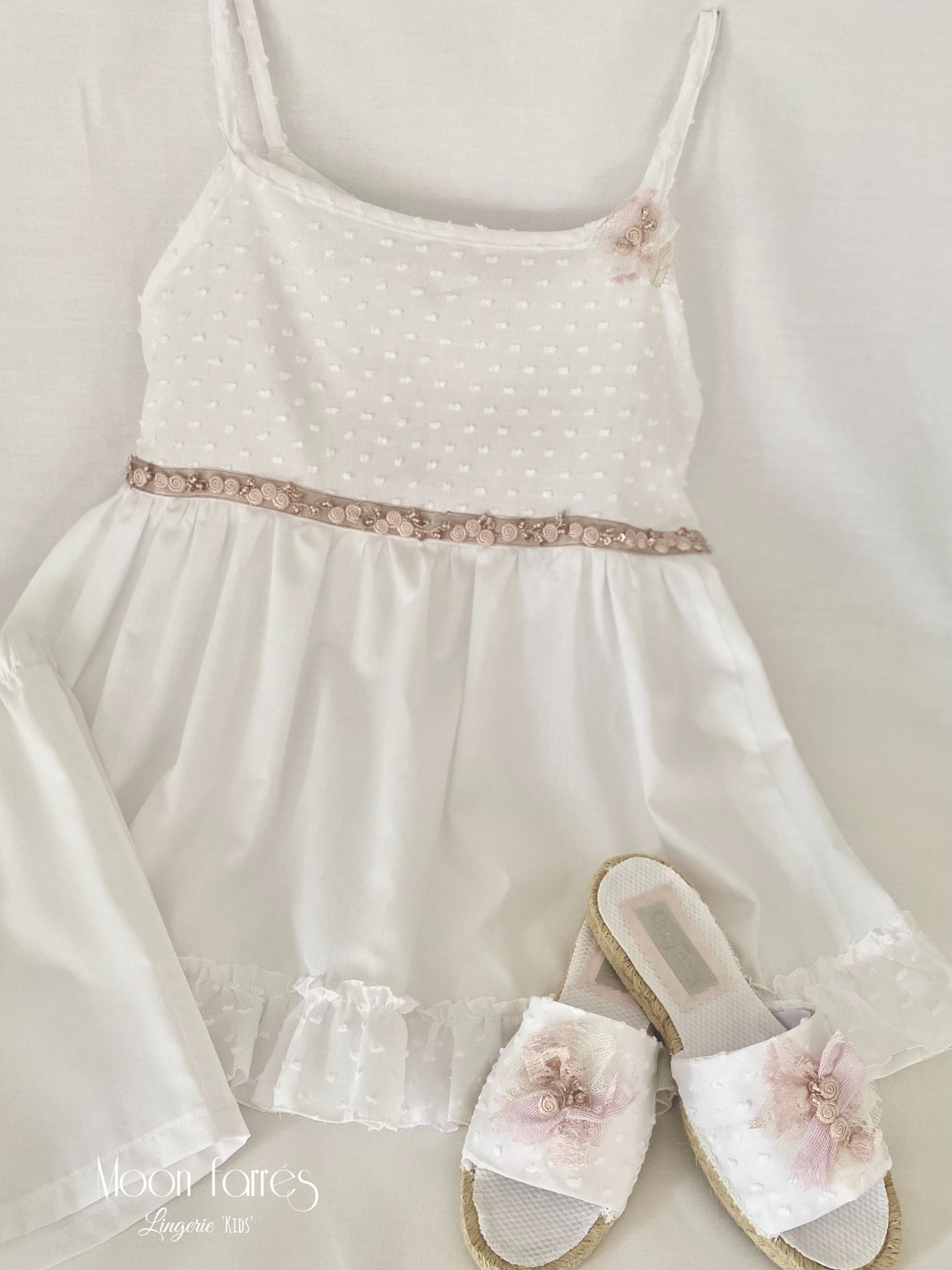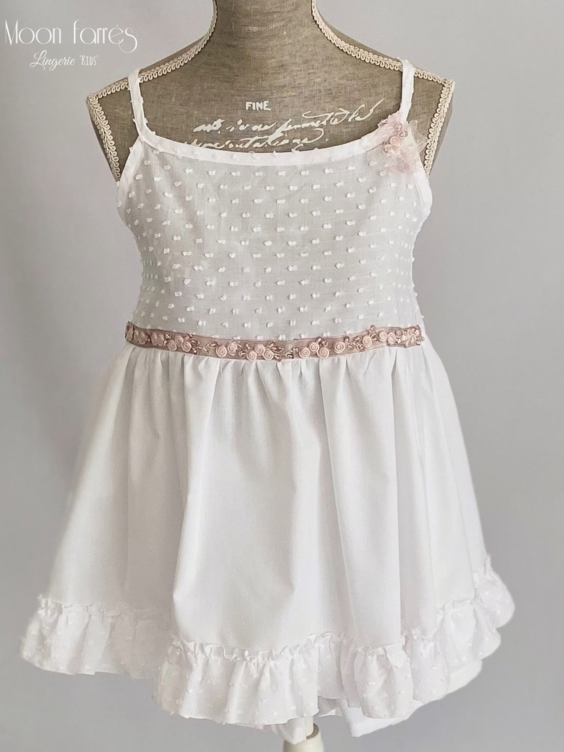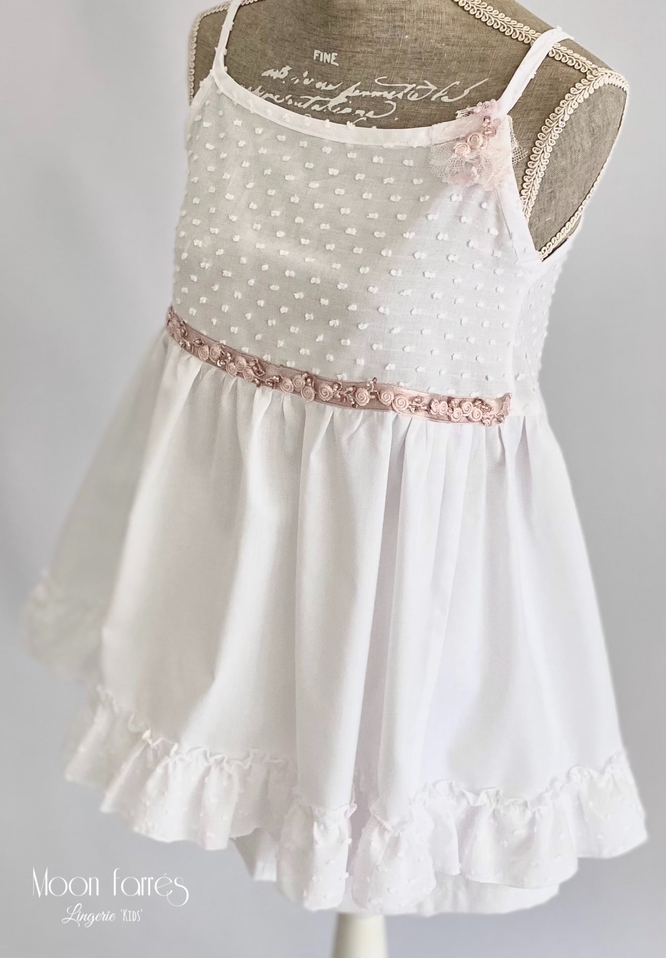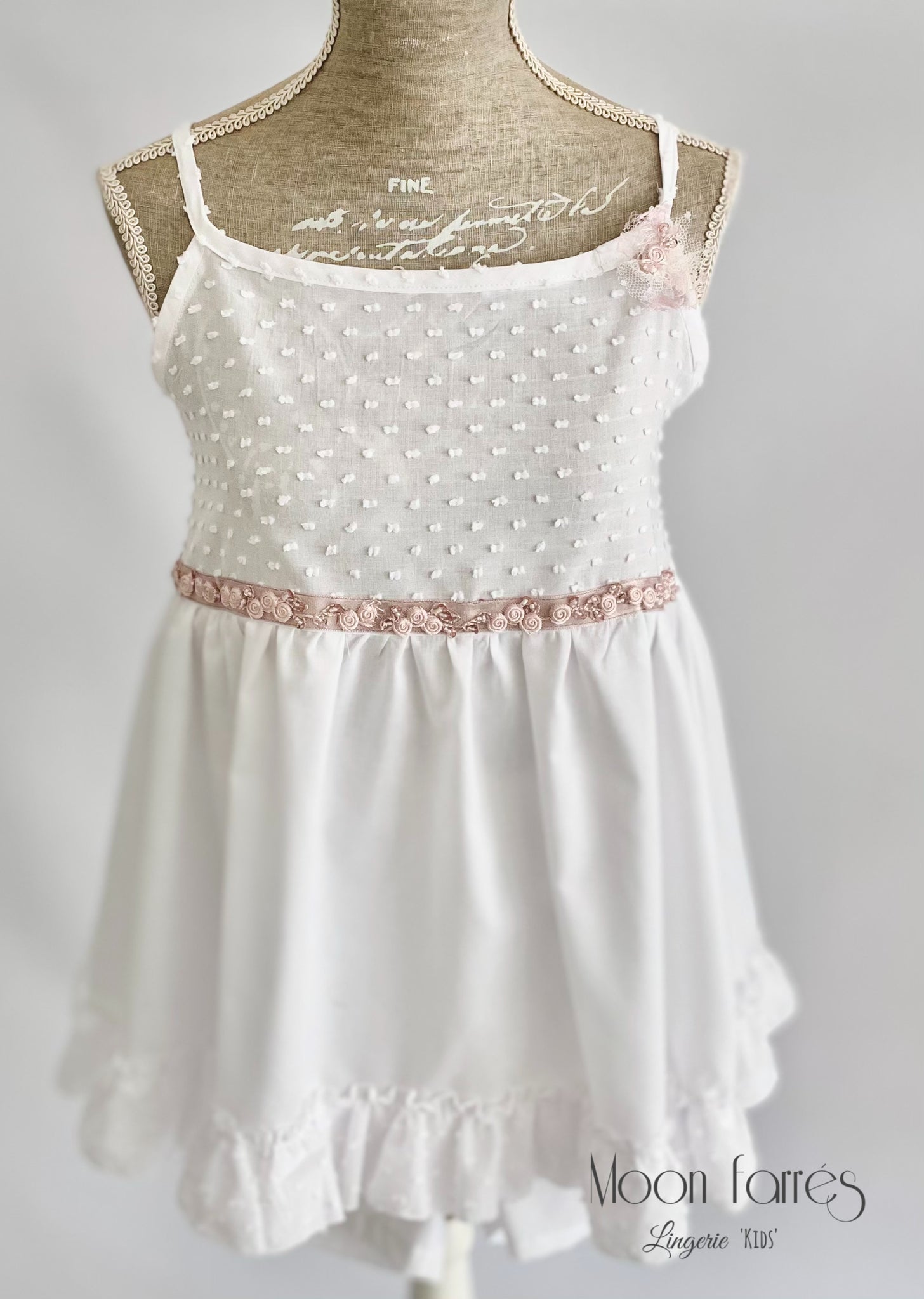 -Cuerpo con talle bajo pecho realizado con tela de batista plumeti de algodoón en color blanco. Tirantes finos del mismo tejido, botonadura trasera con botones.