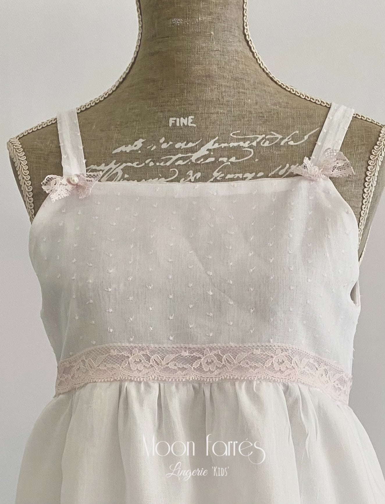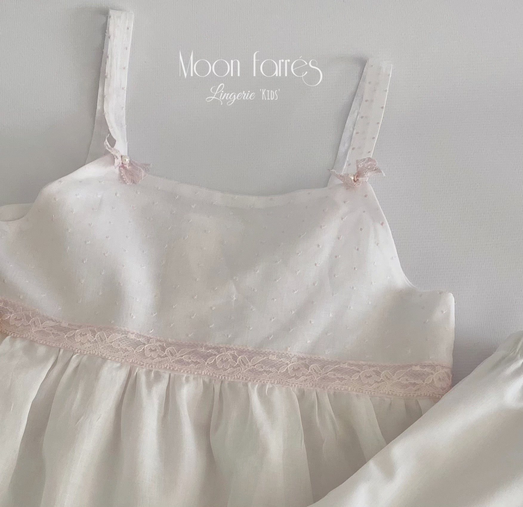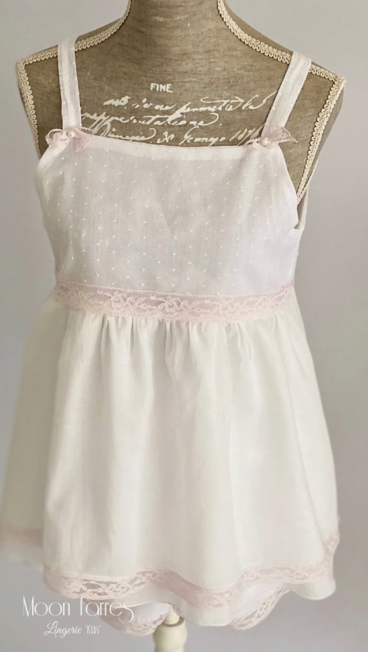 - Canesú y finos tirantes  realizados en batista plumetti con pequeñas motitas en rosa suave. Decoramos los tirantes con pequeños lacitos de puntilla en rosa ceniza y perlita de cristal.