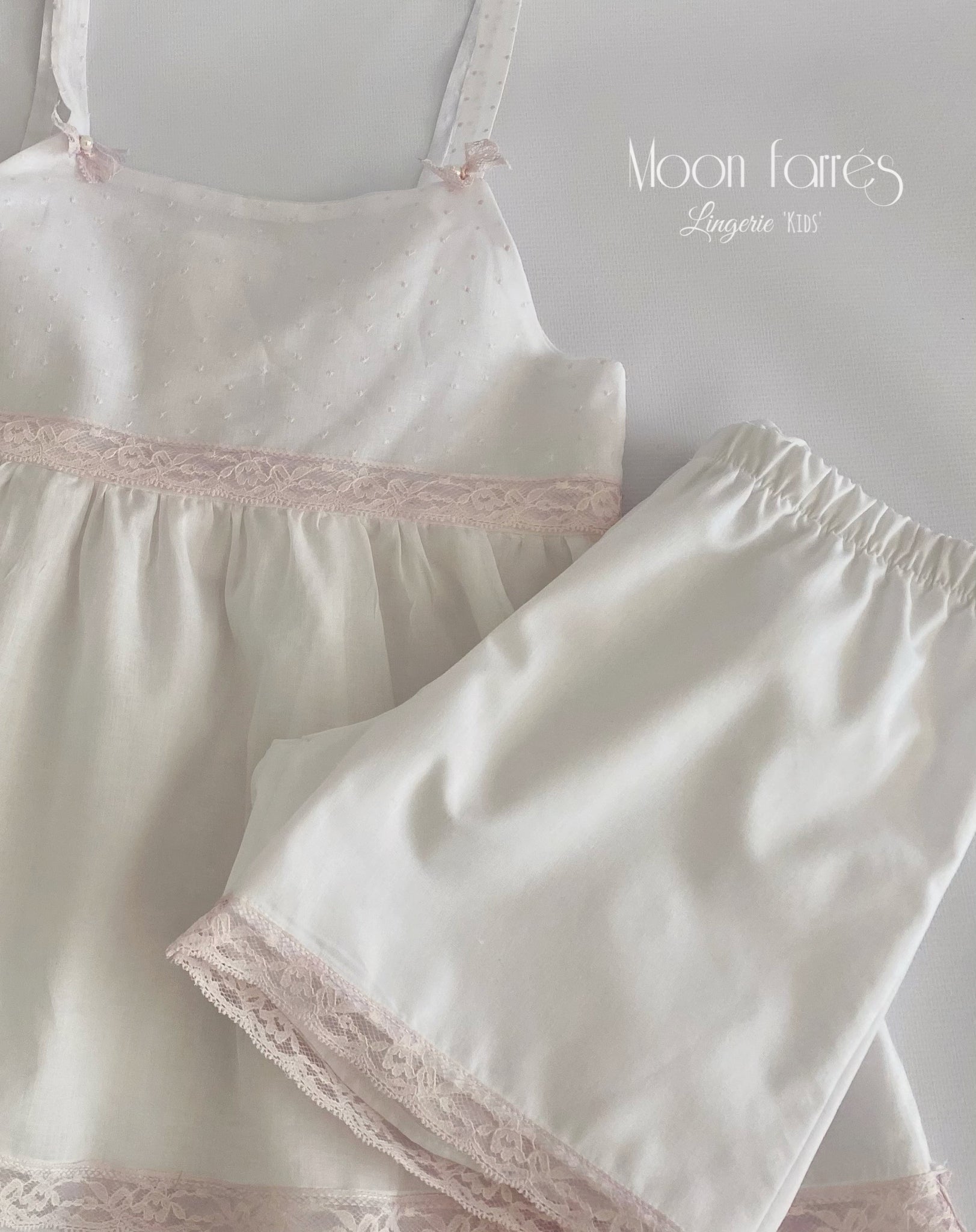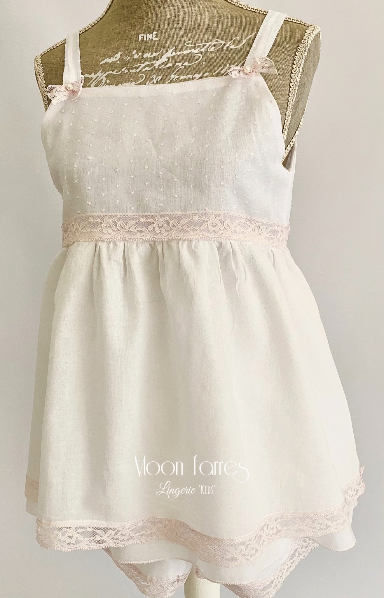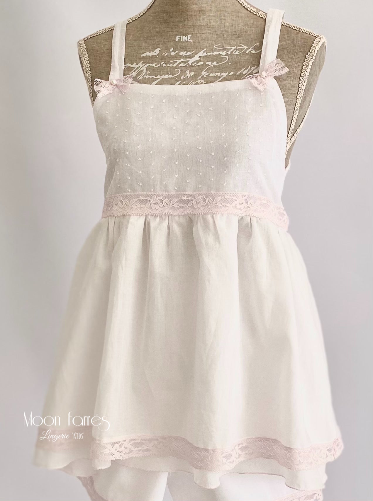 - Canesú y finos tirantes  realizados en batista plumetti con pequeñas motitas en rosa suave. Decoramos los tirantes con pequeños lacitos de puntilla en rosa ceniza y perlita de cristal.