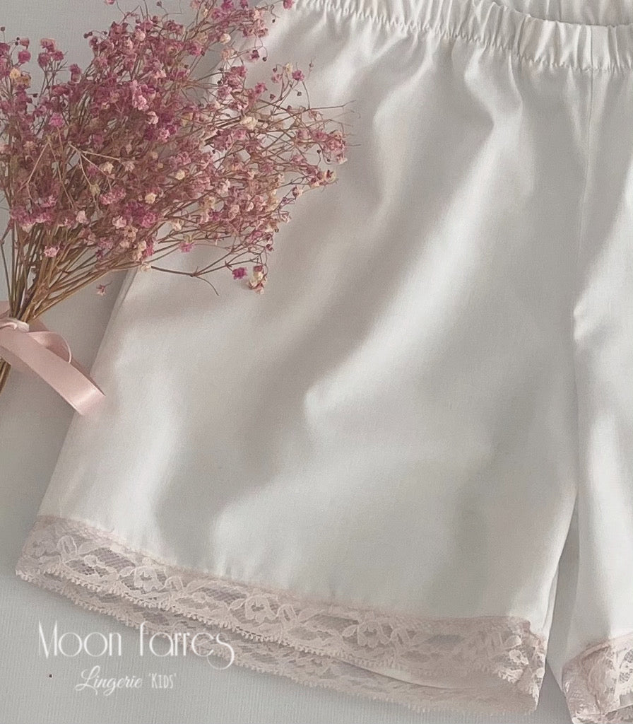 - Pantalón corto de batista de algodón 100% en color blanco. Decoramos con puntilla de encaje a juego con el cuerpo.