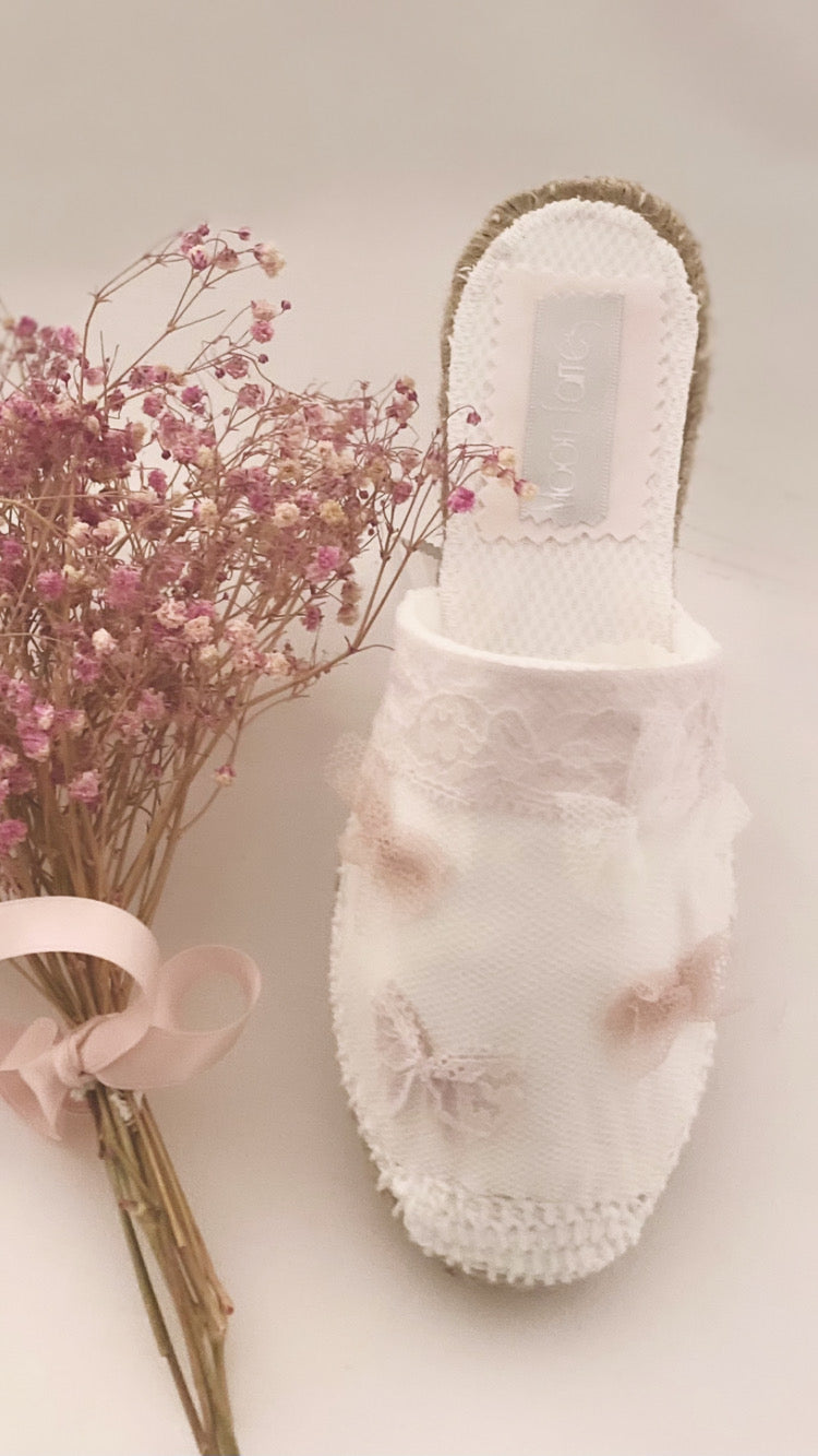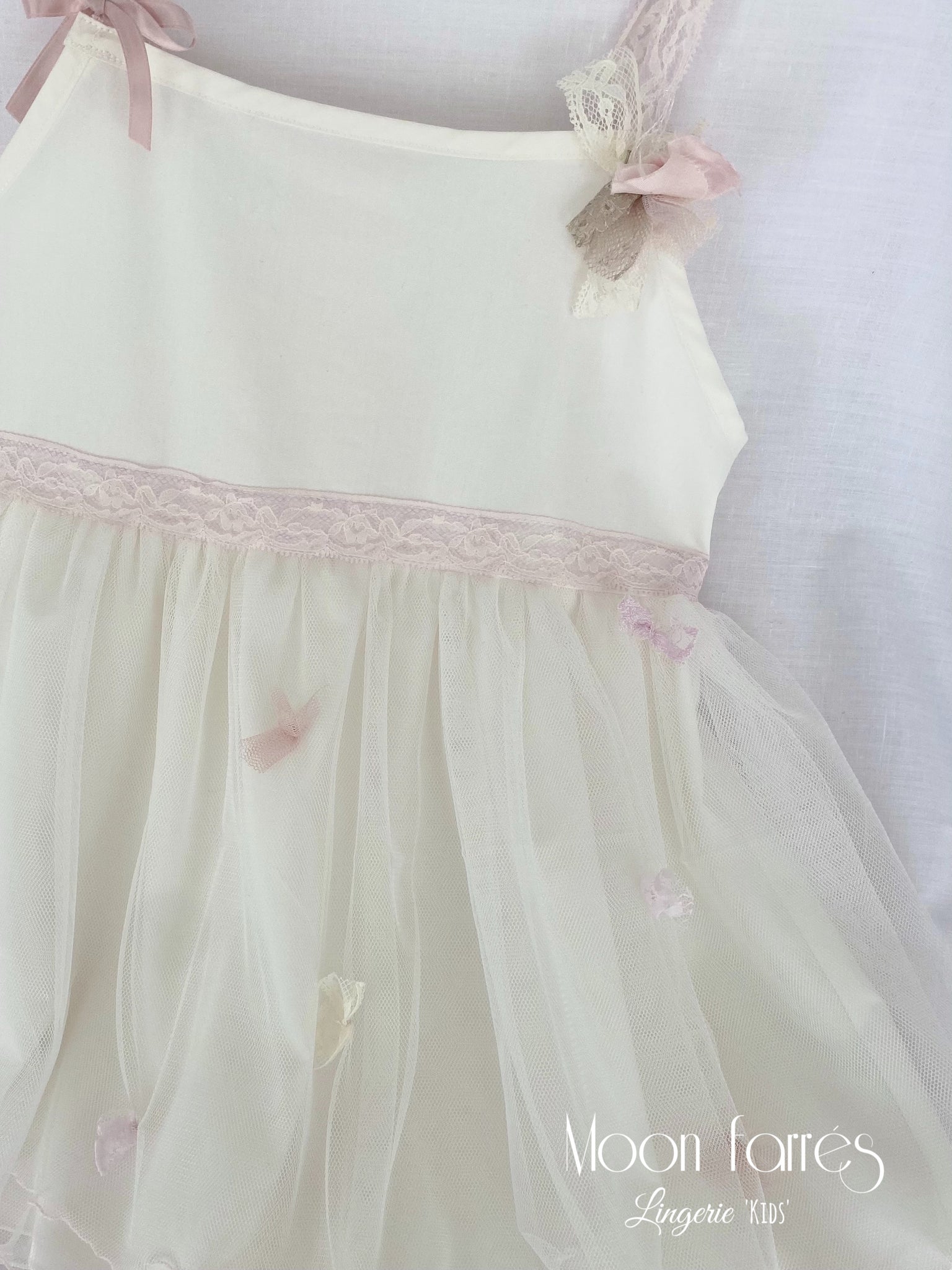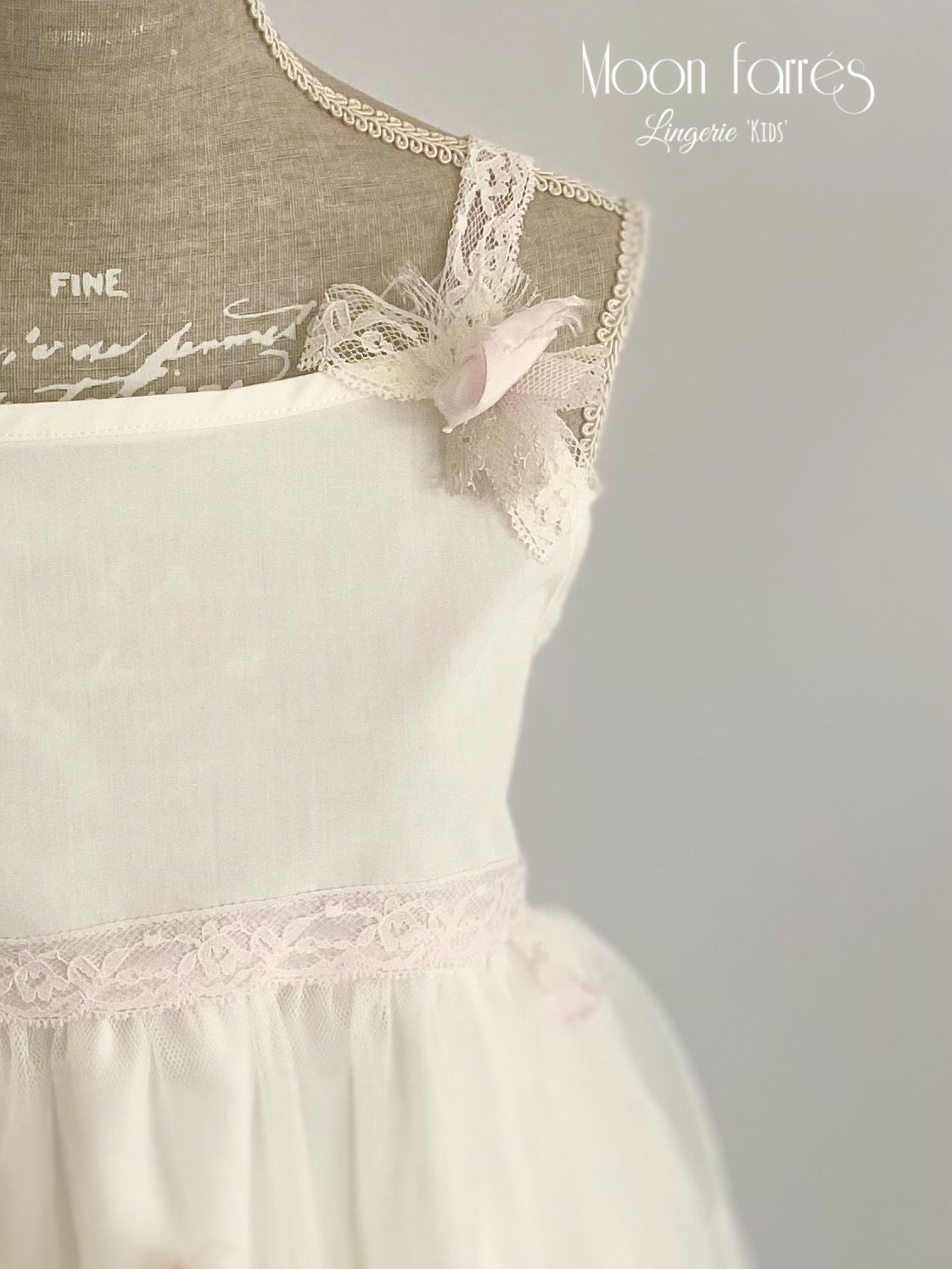 - Canesú y finos tirantes realizados en batista plumetti con pequeñas motitas en rosa suave. Decoramos los tirantes con pequeños lacitos de puntilla en rosa ceniza y perlita de cristal.