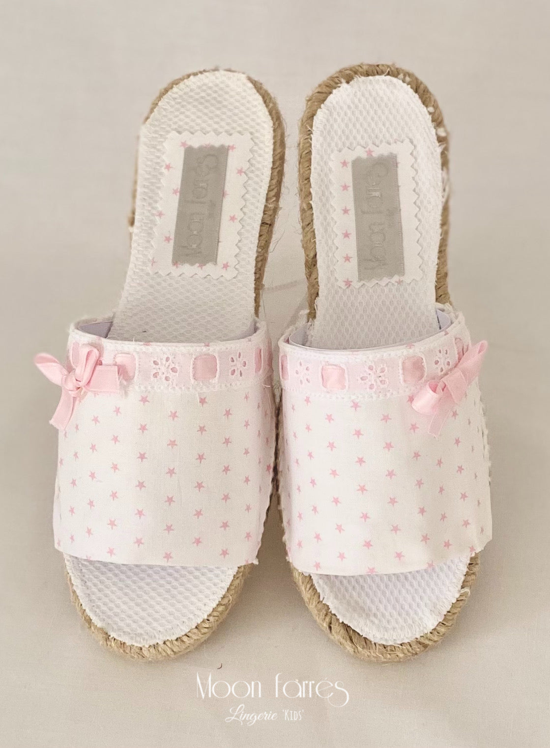 Modelo ESTEL. Suela de Esparto natural. Plantilla de piqué de algodón 100%. Empeine de algodón popelin base en blanco y estrellitas en rosa.