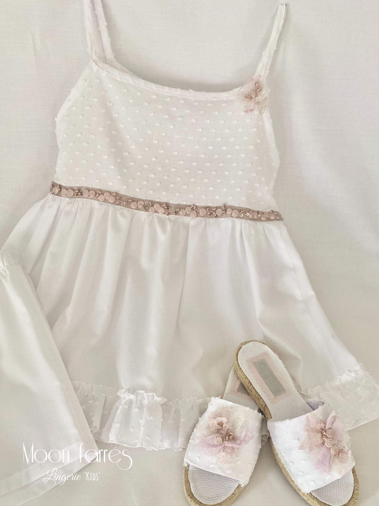 Reinventando uno de nuestros clásicos, la Alpargata!. Hace 20 años empezamos con ellas y nos resistimos a dejarlas. En esta ocasión las adaptamos a nuestros conjuntos de Lenceria para Niñas. Ropita de Dormir para auténticas Hadas.
