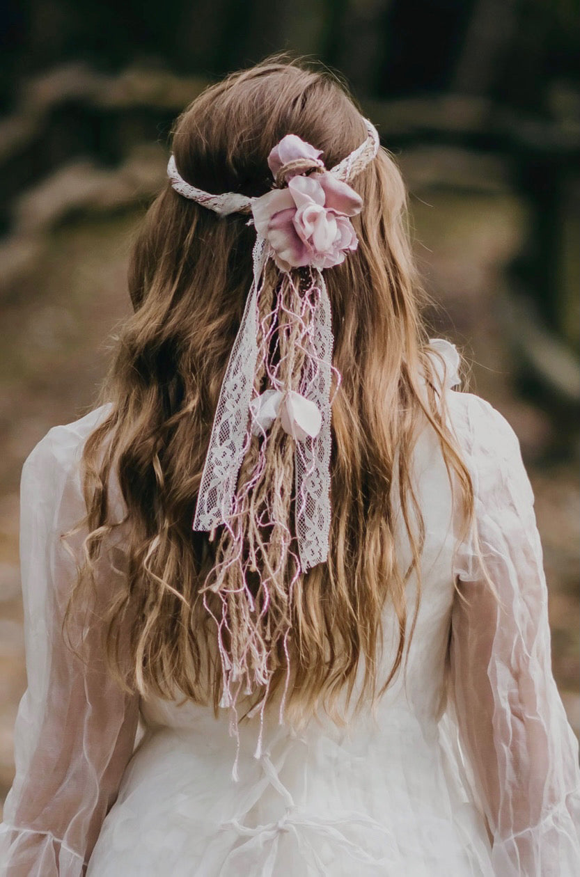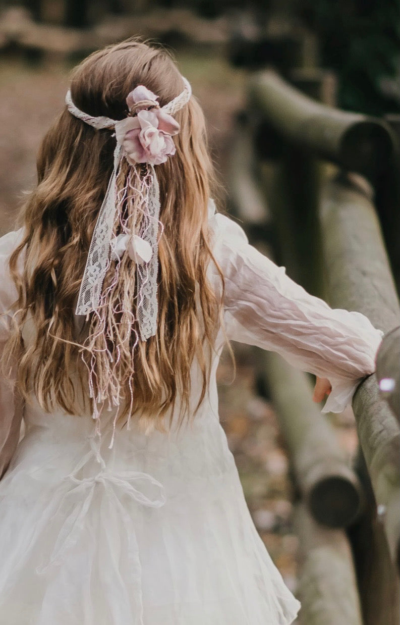 Nuestra Hada de la Luz brilla con este modelo realizado con cuerdas de yute natural combinando cintas de encaje y fantasia, pétalos de flores y organzas teñidas a mano.