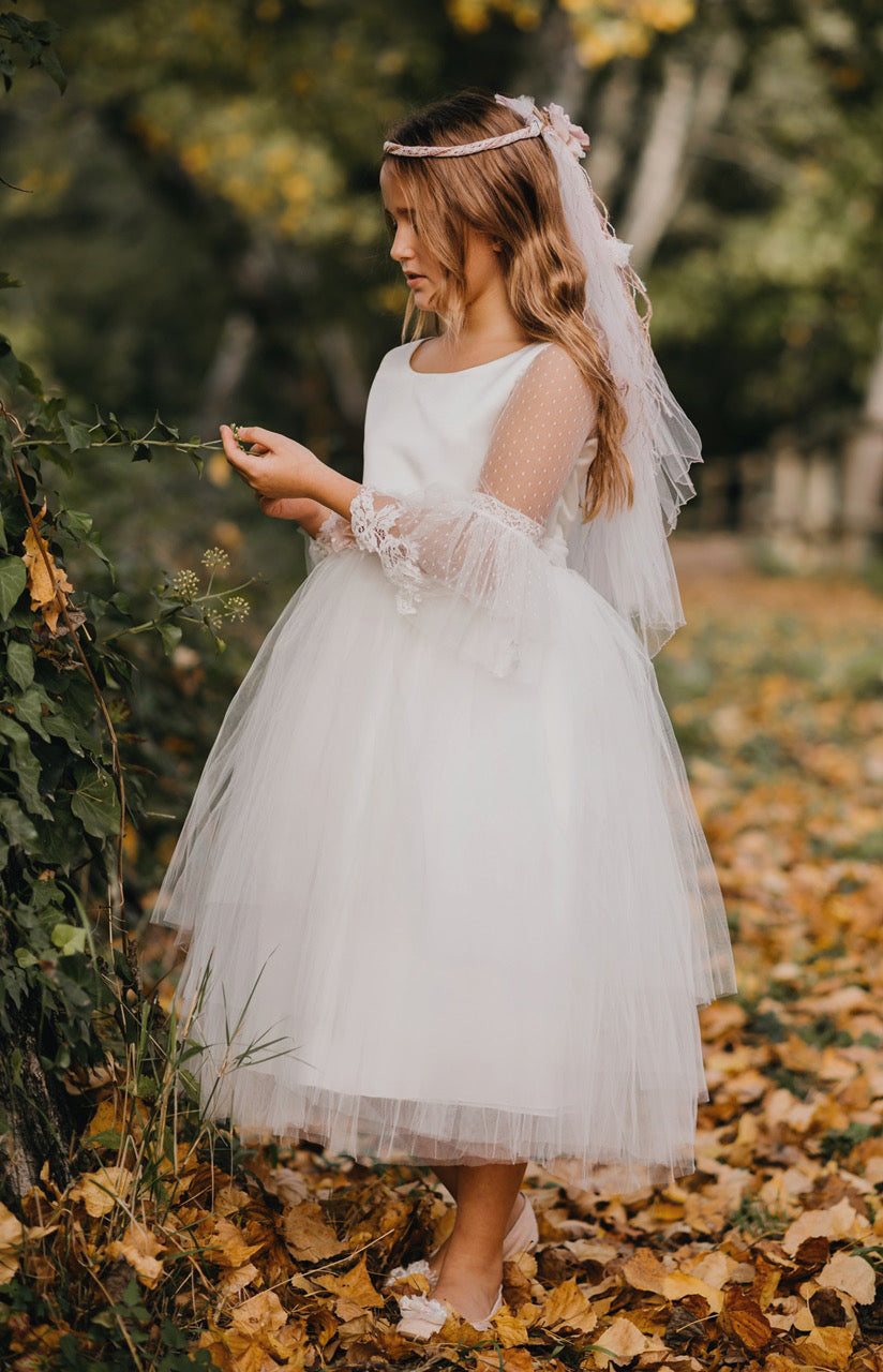 Hemos rescatado un elemento que se utilizó antiguamente en looks de comunión dándole un aire completamente renovado que se adapta de manera exquisita a nuestra colección y a las tendencias más actuales en vestidos de comunión.