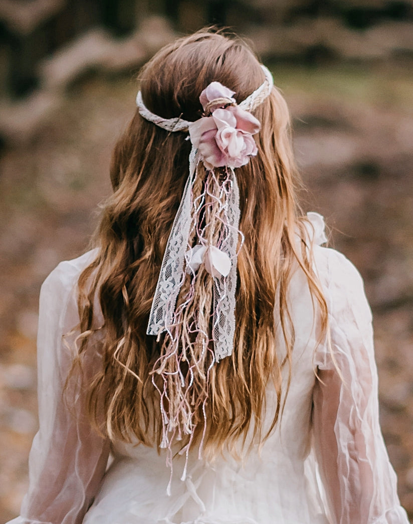 Decora el velo una bonita corona blanda realizada con cuerdas de yute natural, cintas de encaje, y pétalos en forma de flor y caidos con cintas.