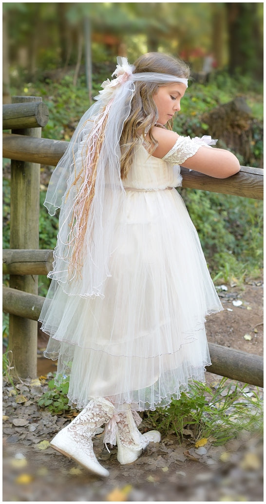 Este modelo lo hemos inspirado en el estilo Boho Chic, una nota esquisita del viejo Hippie envuelto en elegancia y dulzura. Caida del velo y cinta frontal con tul ilusión con efecto arrugado, con ribetes en rosa ceniza.