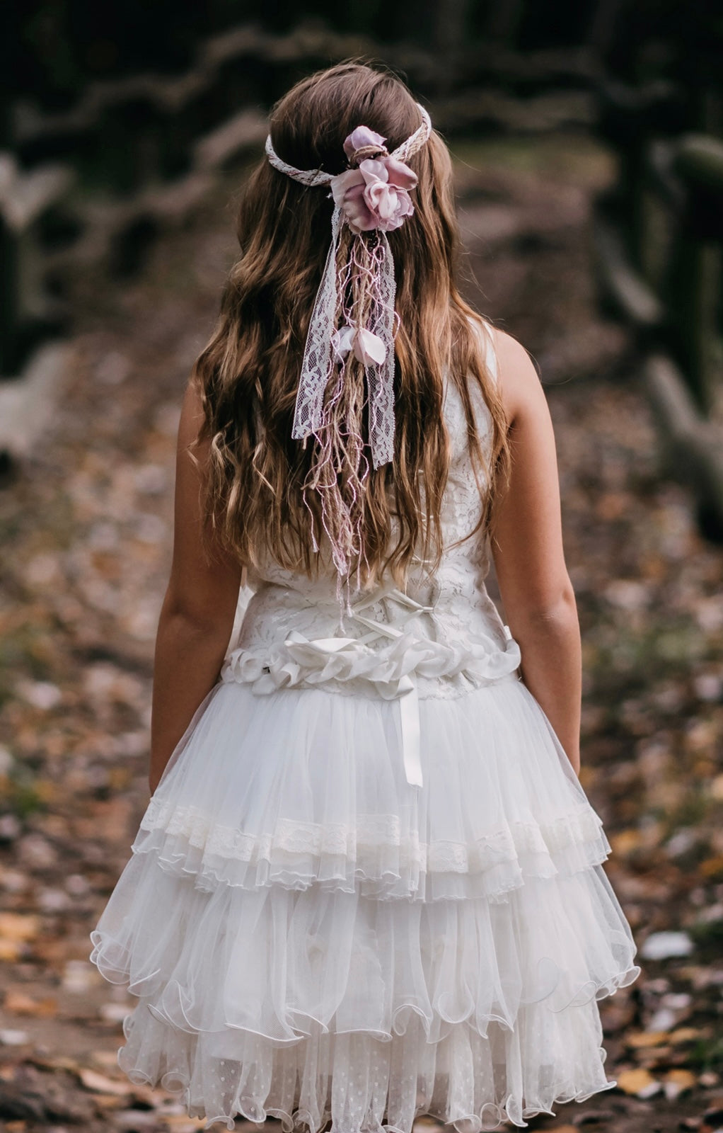 Decoramos la cadera con un original cinturón (Opcional) de perlas de cristal con aplicaciones de flores de organza de seda natural en color marfil y pequeños toques de color en rosa ceniza. El cinturón se ata a la espalda con tiras de gasa de seda y cierre mosquetón.