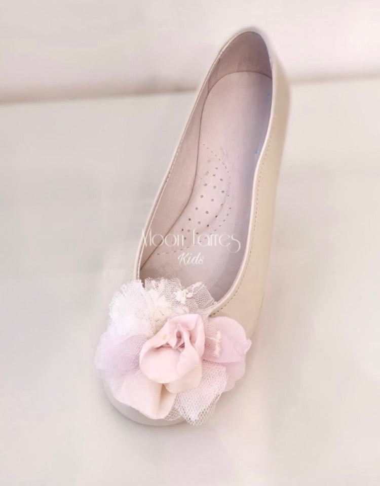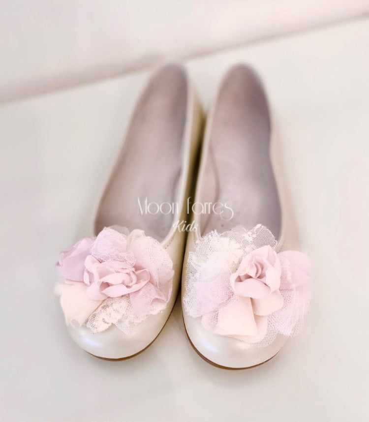 Preciosos Zapatos de niña para Comunión o ceremonia con flores de seda y encaje. Originales y llenos de dulce encanto.