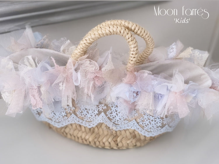 Modelo 'LE CIEL'. Cesto de paja natural decorado con mil pétalos de organzas, gasas, tules y encajes en tonos crudo natural y rosa ceniza y celeste 'TEÑIDO A MANO'
