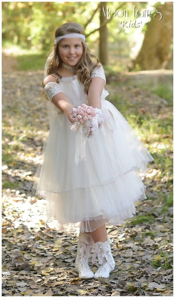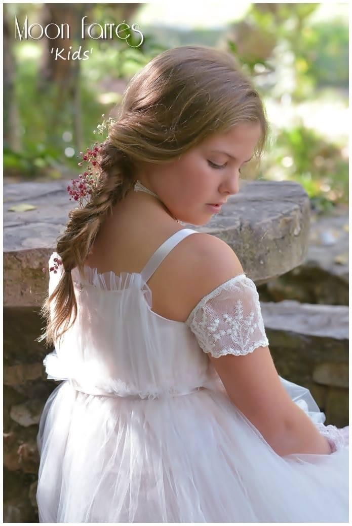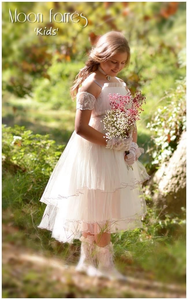 Vestido muy romántico de estilo vintage para Comunión o Ceremonia. Multicapas de tul ilusión efecto arrugado.