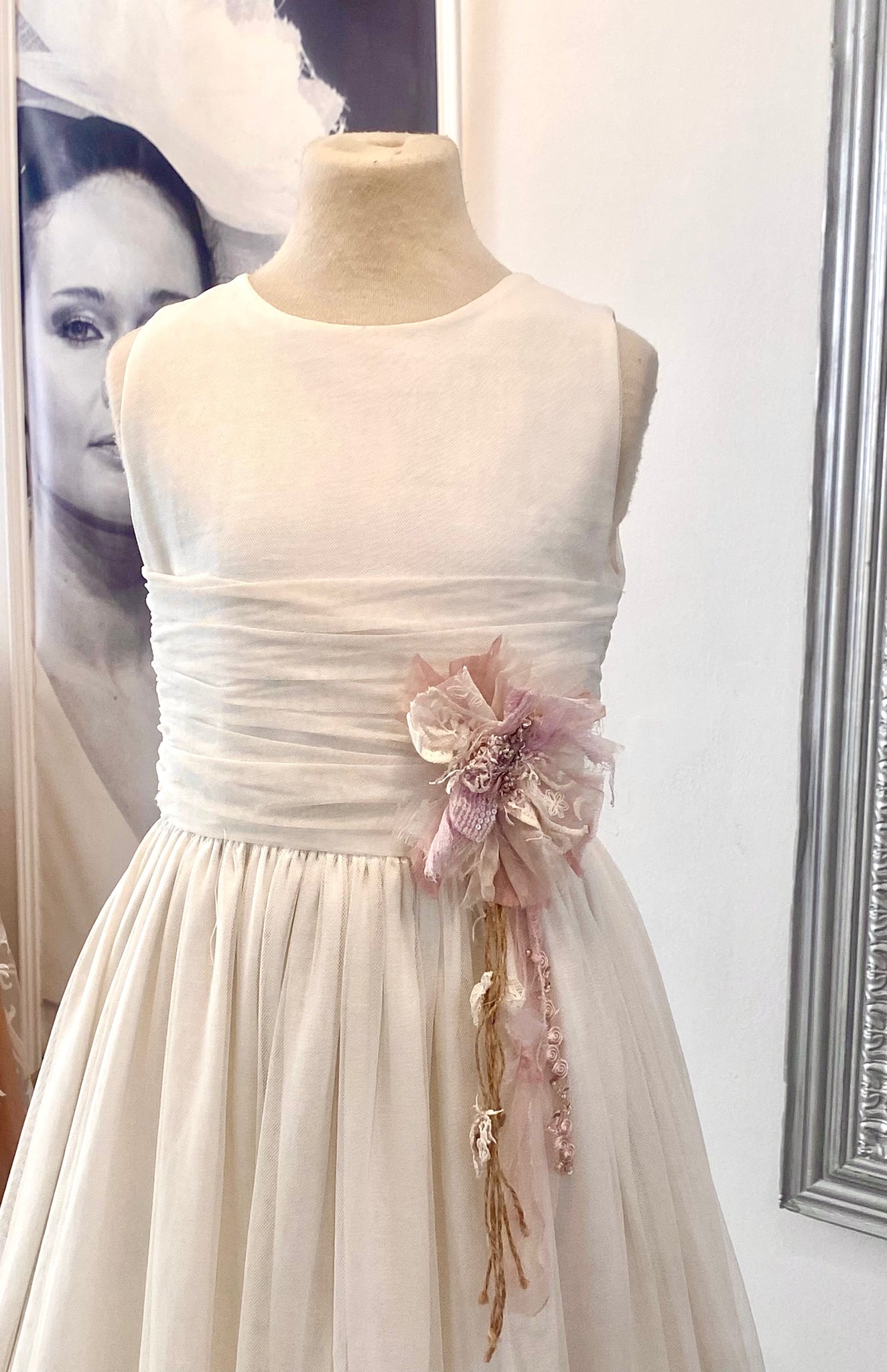 VESTIDO LARGO CON CUERPO A CINTURA EN COLOR IVORY NATURAL. DRAPEADO DE TUL EN LA CINTURA. SIN MANGAS. ESCOTE REDONDO. DECORACIÓN DE FLOR A JUEGO CON ORGANZA, SEDA Y YUTE EN TONOS BLANCO ROTO Y ROSA VIEJO. FLOR ATADA CON BROCHE.
